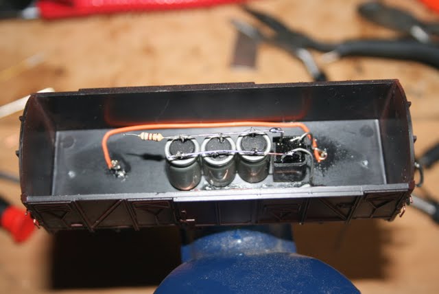 Энергии из конденсаторов,хватает секунд на 6 .Снимаю вагон с рельсов,а фонари продолжают светится .