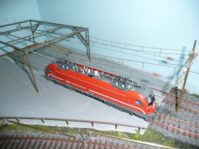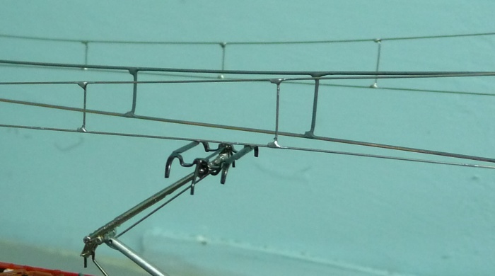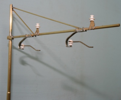 Многие фирмы такие как Marklin,Viessmann,Vollmer,Lima ,Hornby и т.д ,изготавливают линии для подачи тока для локомотивов которые двигаются благодаря токосьёму на пантографах.Их можно купить,но к сожалению не всегда,везде и за приемлемую цену.Один из методов их изготовления на дому в фото.При использовании других методов подачи тока моделям такие линии можно строить как декорации к макету .